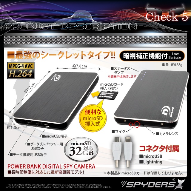 | 【注意事項】 | ・外部機器への充電機能は簡易的なものになります。 ・バッテリー稼働時間は理論値であり稼働時間を保証するものではありません。 ・製品ケースや本体のデザインは改良のため予告なく変更される事があります。 ・プライバシーの侵害・迷惑防止条例等に抵触する行為には使用しないでください。 ・輸入品につき、製品箱等にキズ/汚れがある場合がございます。 |