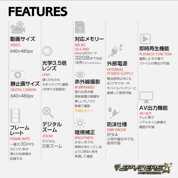 | 【製品機能】 | ・動画撮影 ・静止画撮影 ・赤外線撮影 ※可視タイプ ・画面輝度調節機能(レベル:1~3) ・暗視補正機能 ・光学3.5倍レンズ(固定) ・デジタル2倍ズーム ・AV出力機能 ・外部電源機能 ・即時再生機能 |