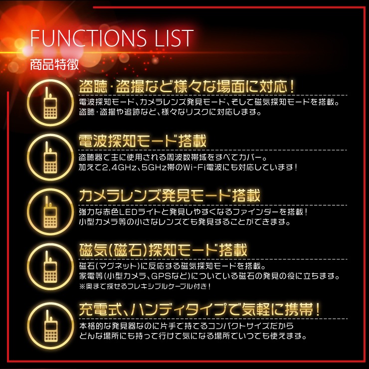 | 主な機能 | ・電波探知モード ・カメラレンズ発見モード ・磁気探知モード ・バイブレーションモード(電波探知モード) |