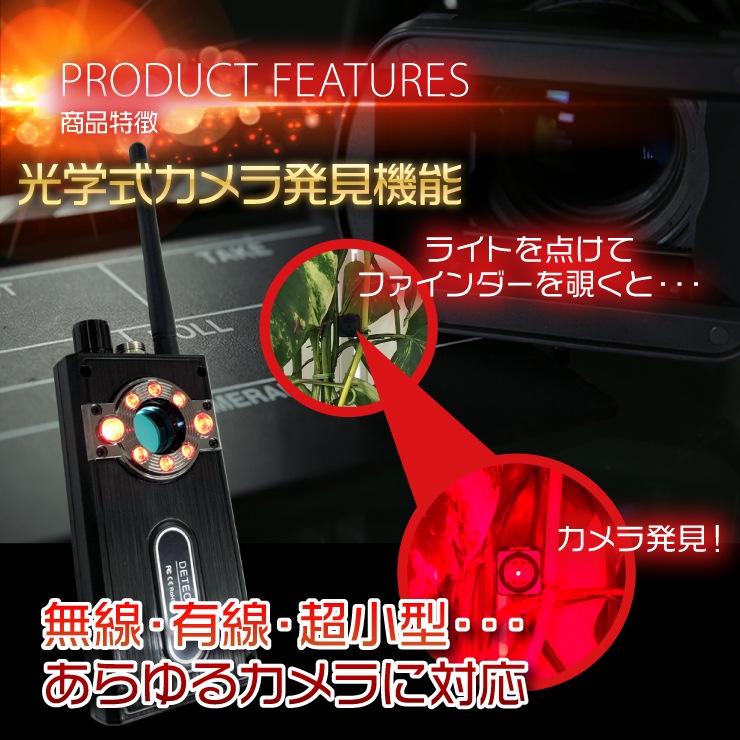 無線有線問わずどんな隠しカメラでもレンズ部分を発見できるカメラレンズ発見モードを搭載。