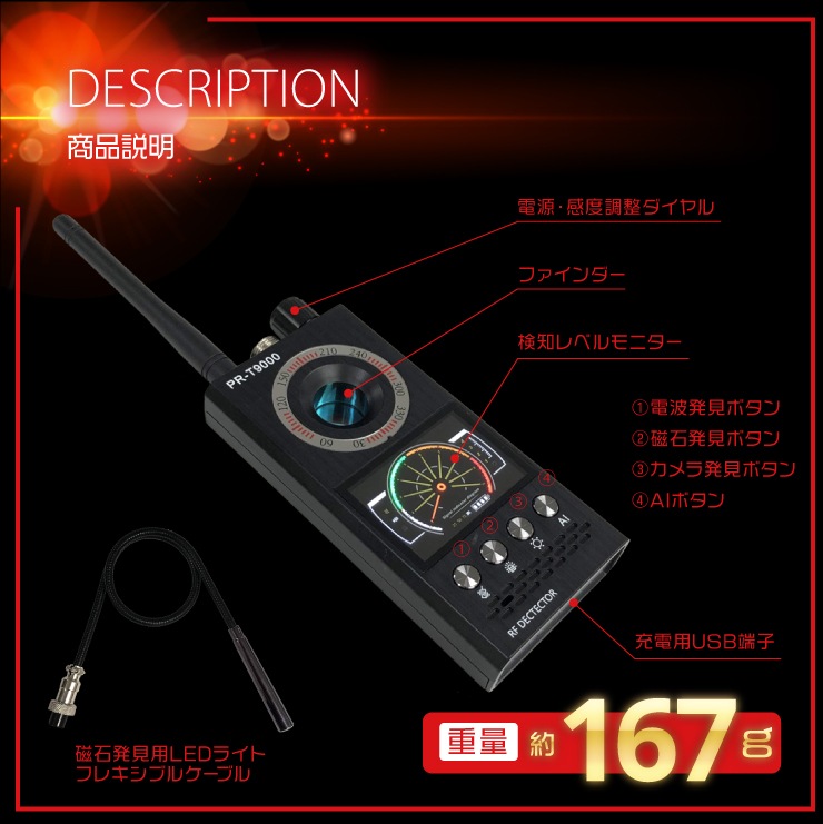 盗聴器、盗撮カメラの電波を発見する盗聴盗撮電波発見器に、磁気(磁石)を発見するためのセンサーを搭載した複合機。盗聴盗撮磁力発見器と3つの要素は探偵調査でもよく見かける案件です。本機の最大の特徴として、42Cmもの長さがあるフレキシブルケーブルの先端に搭載したLEDライトと磁気センサー。今まで届かなかった奥まった場所やかがまないと調査しづらかった場所でも、くまなくしっかりと調査する事ができます。