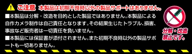 | 注意事項 | ※輸入品につき、製品・箱等に多少の汚れ・キズがある場合がございます。ご了承ください。著しい破損や初期不良については期間内に限り、交換させて頂きます。 ※本製品は非防水です。雨天や水中撮影は故障の原因になります。 ※本製品は安定動作のためにACアダプタ接続動作を推奨します。 ※記載している連続動作時間は新品状態での実測に基づく参考値です。新品状態でも使用する環境温度や状況などにより変化しますので、この数値を保証するものではありません。新品状態でフル充電直後の連続使用時間が参考値の80%以上であれば正常とみなします。充電池の仕様上、使用頻度、経年劣化でこの数値は下がります。 ※本製品は精密機器です。取扱いには十分ご注意ください。 |