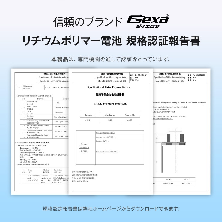 本製品は電気用品安全法(PSE)の技術基準に適合した、安心してご利用いただけるリチウムポリマー充電池です。