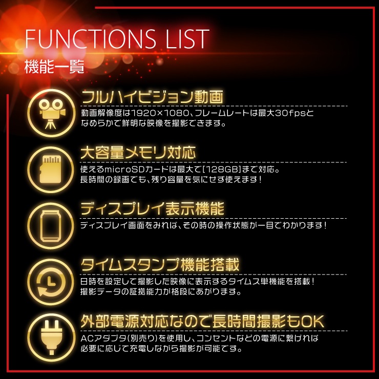 | 付属品 | USBケーブル、リストベルト、固定用両面テープ、SDカードスロットカバー、日本語説明書 |