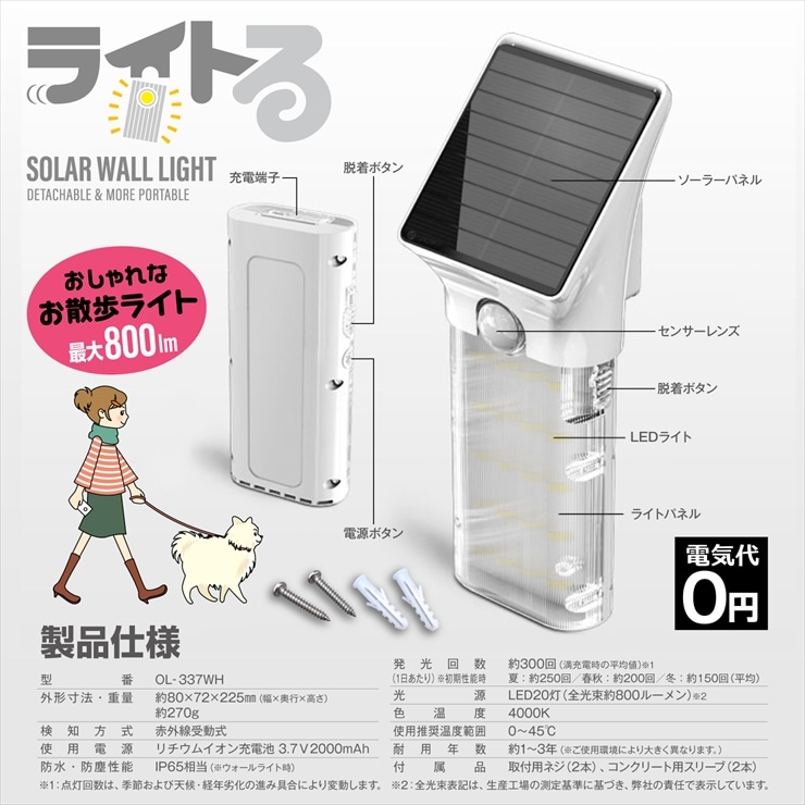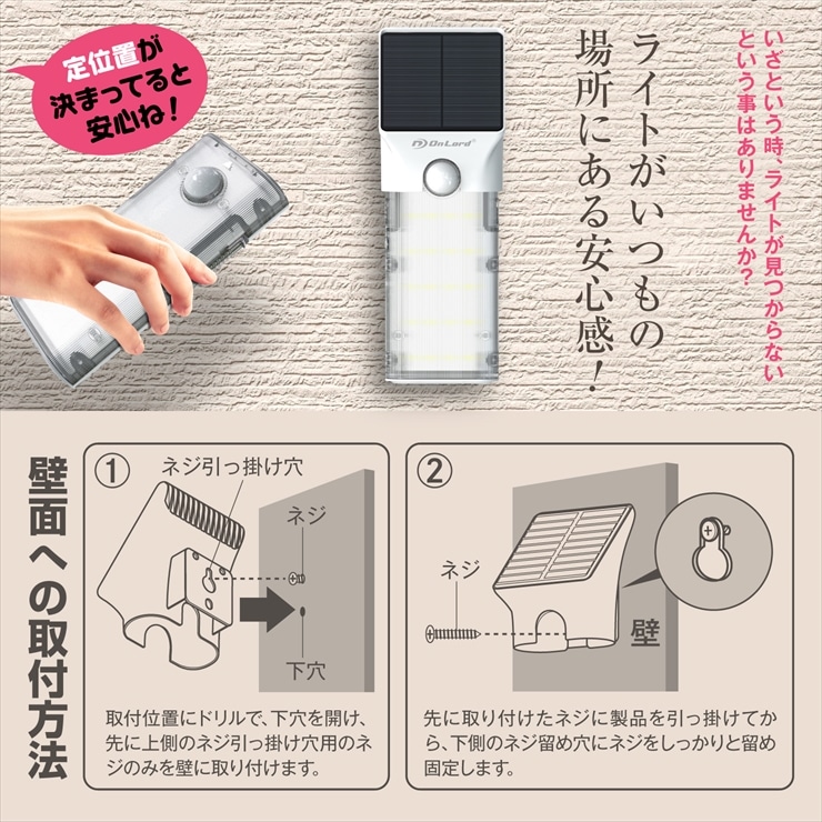 オンロード(OnLord) ソーラー充電式 脱着式センサーライト ライトる ハンディーライト LED 人感センサー 自動発光 防水 OL-337WH