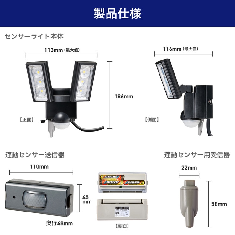 | 付属品 | 付属品:本体用取付ネジ 2本(Φ4×38mm)、コンクリート用スリーブ 2本(Φ6×30mm)、マスキングカバー 1個、クランプ 1セット、拡散パネル 2個、連動センサー用受信器 1個、取付ガイド 1枚 |