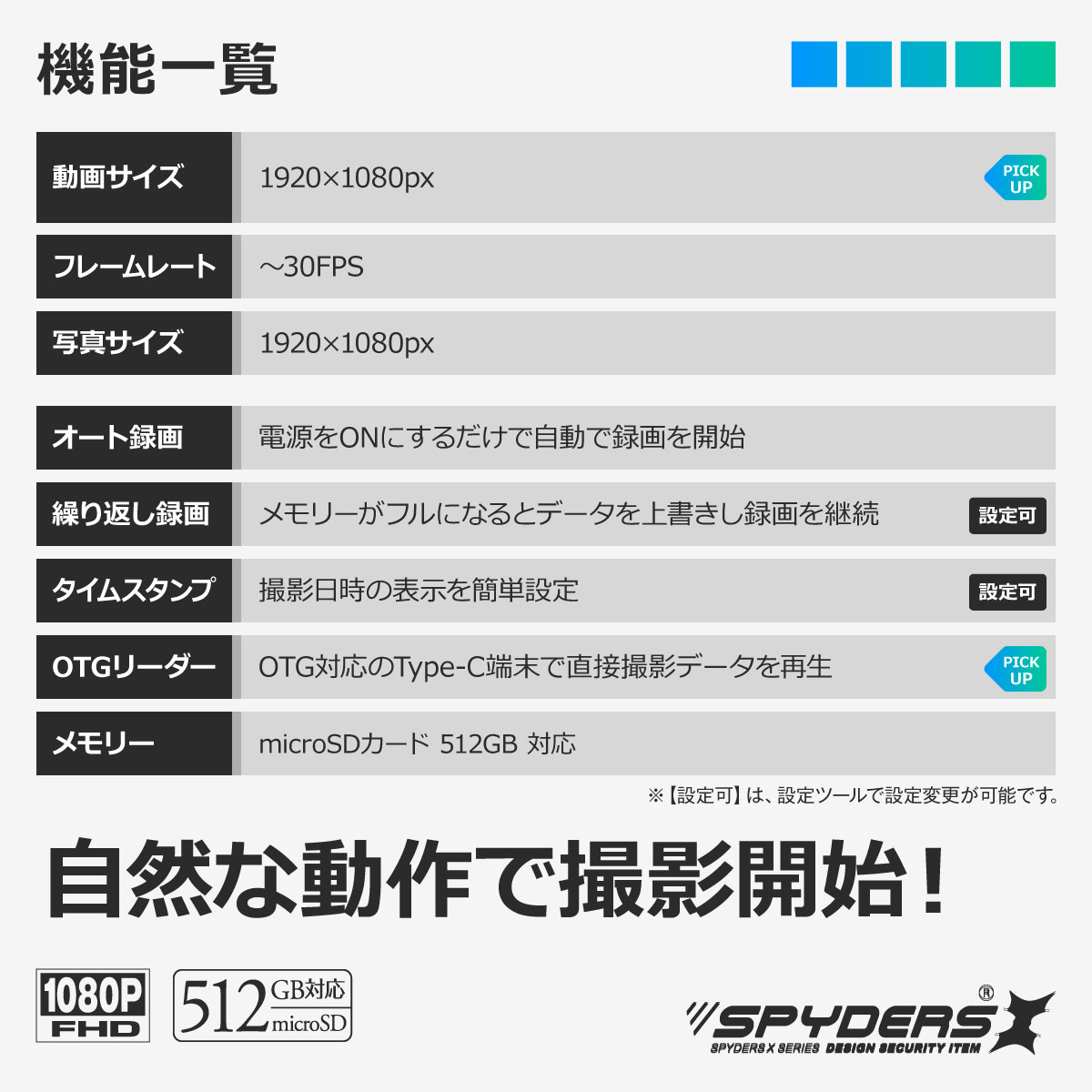 | 【製品機能】 | ・動画撮影 ・写真撮影 ・オート録画 ・繰り返し録画 ・OTGリーダー ※本製品のOTGリーダー機能はOTGを有するType-C端末専用となります。 |