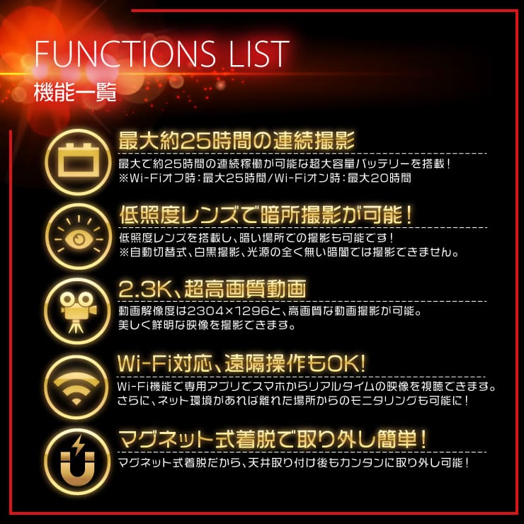 | 機能 | ・動画撮影 ・静止画撮影(アプリのみ) ・低照度撮影(自動切替) ・デジタルズーム(アプリのみ) ・Wi-Fi機能(AP/IP接続) ・自動上書 |
