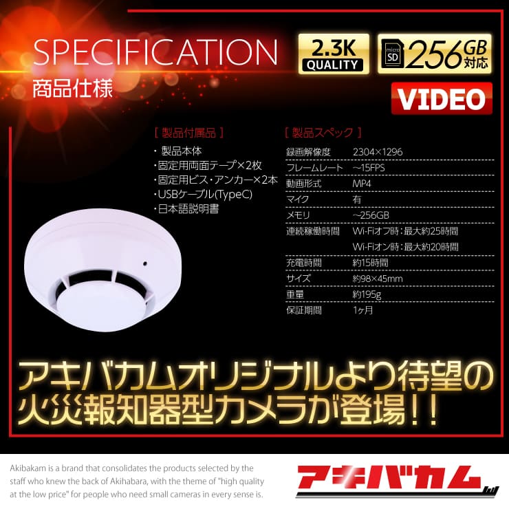 アキバカムオリジナル Wi-Fi対応 2.3K高画質 大容量バッテリー搭載 低照度レンズ 火災報知器型カメラ ABC-KSI2