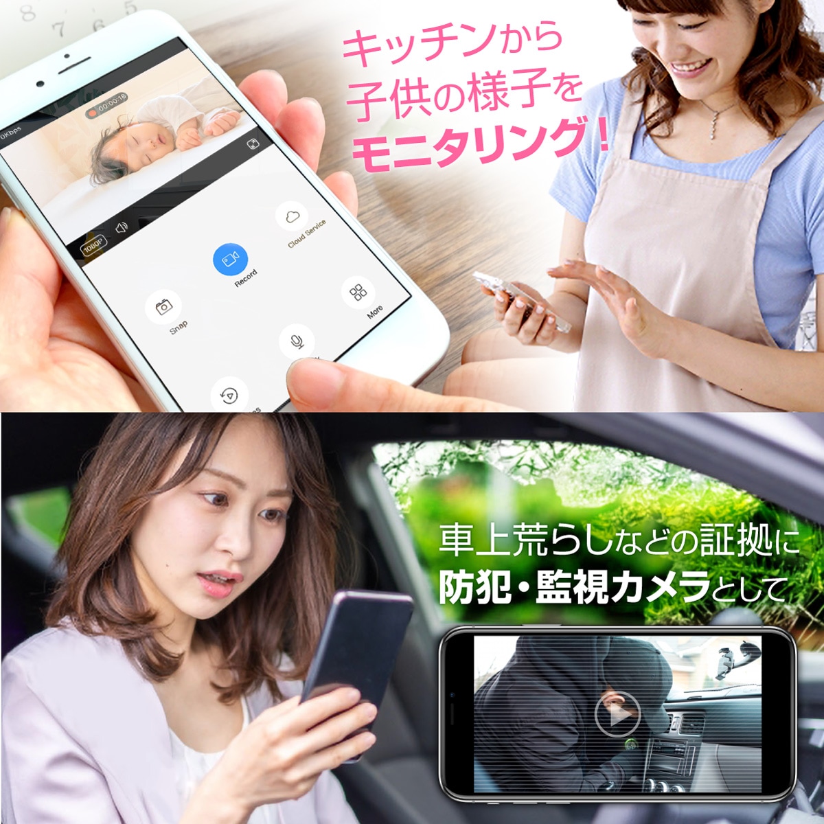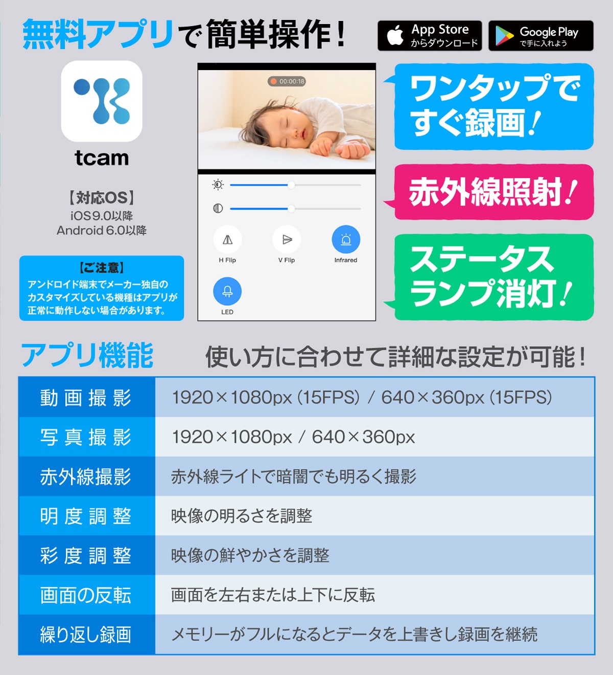 | 【製品機能】 | ・動画撮影 ・写真撮影 ・赤外線撮影(不可視) ・繰り返し録画 ・外部電源 ・オート録画 ・外部充電 ・Wi-Fi接続(ダイレクト接続/インターネット接続) ※一部機能はスマホ等によるアプリでの操作が必要となります。 |