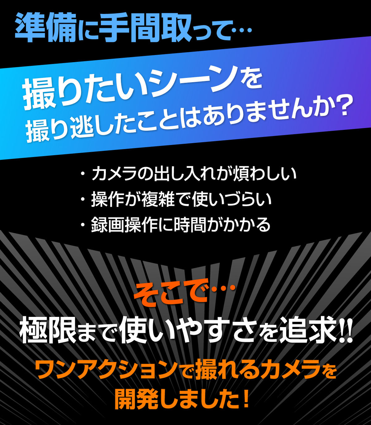 ★極限まで使いやすさを追求!ワンアクションで撮れるカメラを開発!撮りたいシーンを逃さない!★
