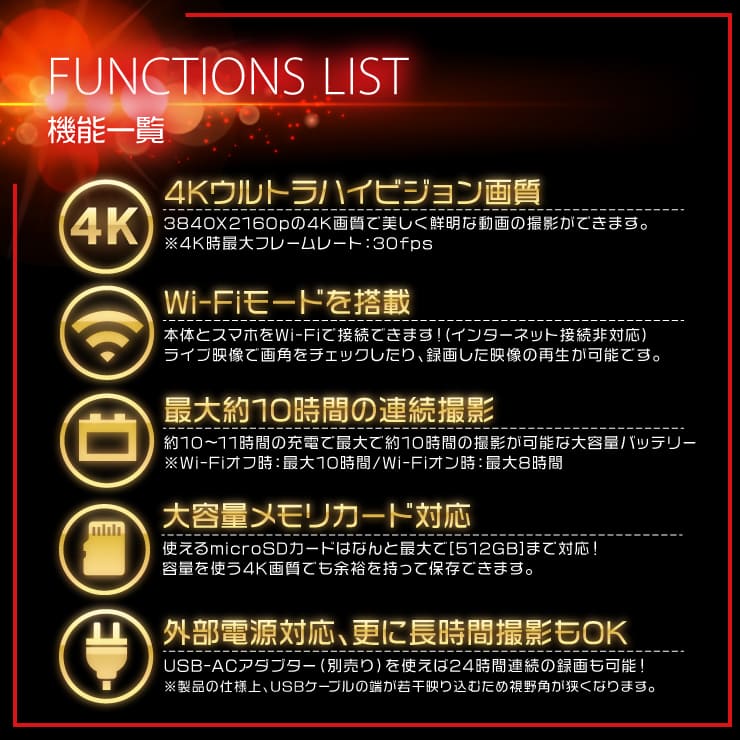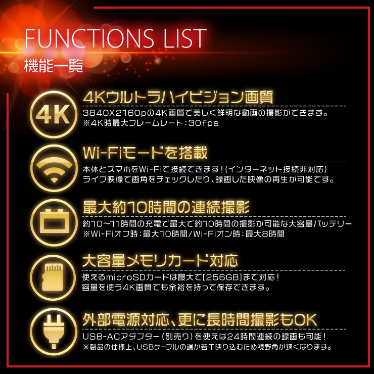 | 機能 | ・動画撮影 ・静止画撮影(アプリのみ) ・Wi-Fi機能(AP接続) ・外部電源機能 ・自動上書 |