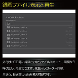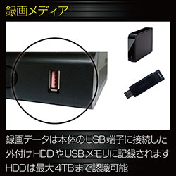 録画データは本体前面のUSB端子に接続した外付けHDDやUSBメモリに記録されます。HDDは最大4TBまで認識可能です。