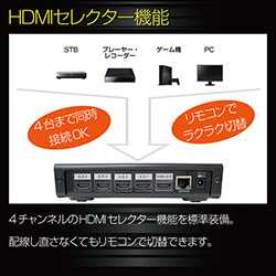 HDMIの入力端子を4口搭載。いちいち再生側の機器を繋ぎ変えずとも4台まで同時接続でき、リモコンのボタン一つで切り替えができます。