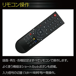 録画・再生・各種設定はすべてリモコンで操作します。良く使う機能には専用のショートカットボタンも搭載。入力信号の切り替え(1CH~4CH)もボタンひとつで実行できます。