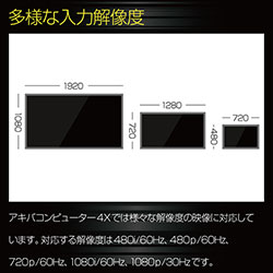 アキバコンピューター4Xでは様々な解像度の映像に対応しています。対応する解像度は480i/60Hz、480p/60Hz、720p/60Hz、1080i/60Hz、1080p/30Hzです。