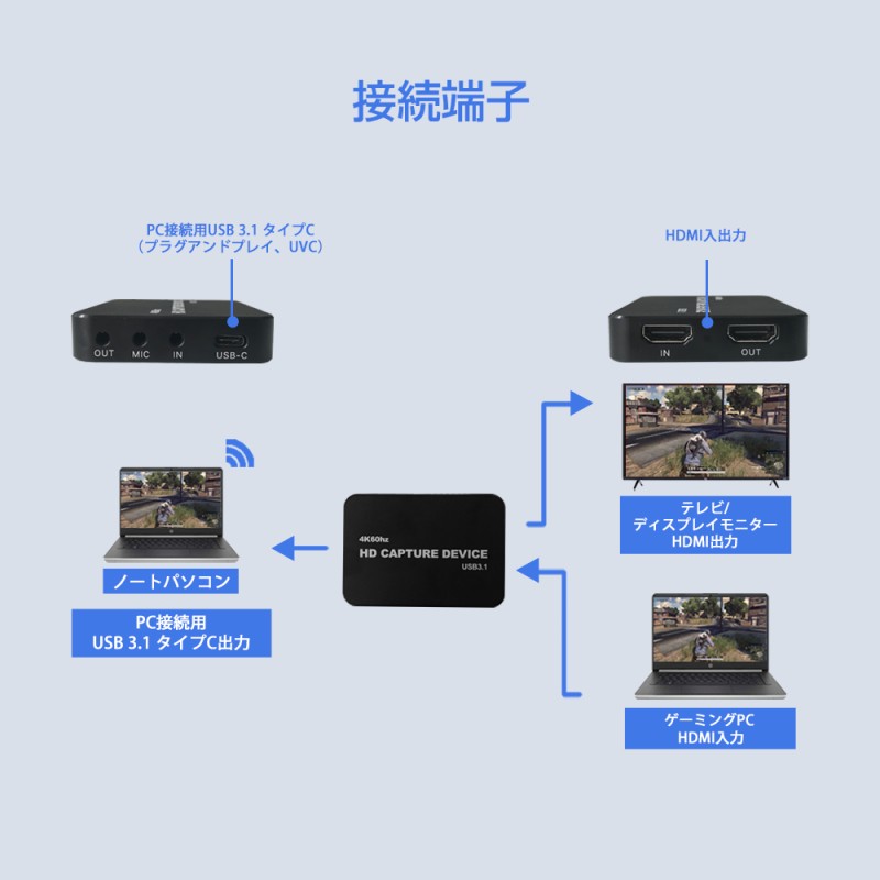 | 接続端子 | PC接続用USB 3.1 タイプC(プラグアンドプレイ、UVC)、HDMI入力×1、HDMI出力×1、 Line in×1(3.5mm)、Line out×1(3.5mm)、マイク入力×1(3.5mm) |