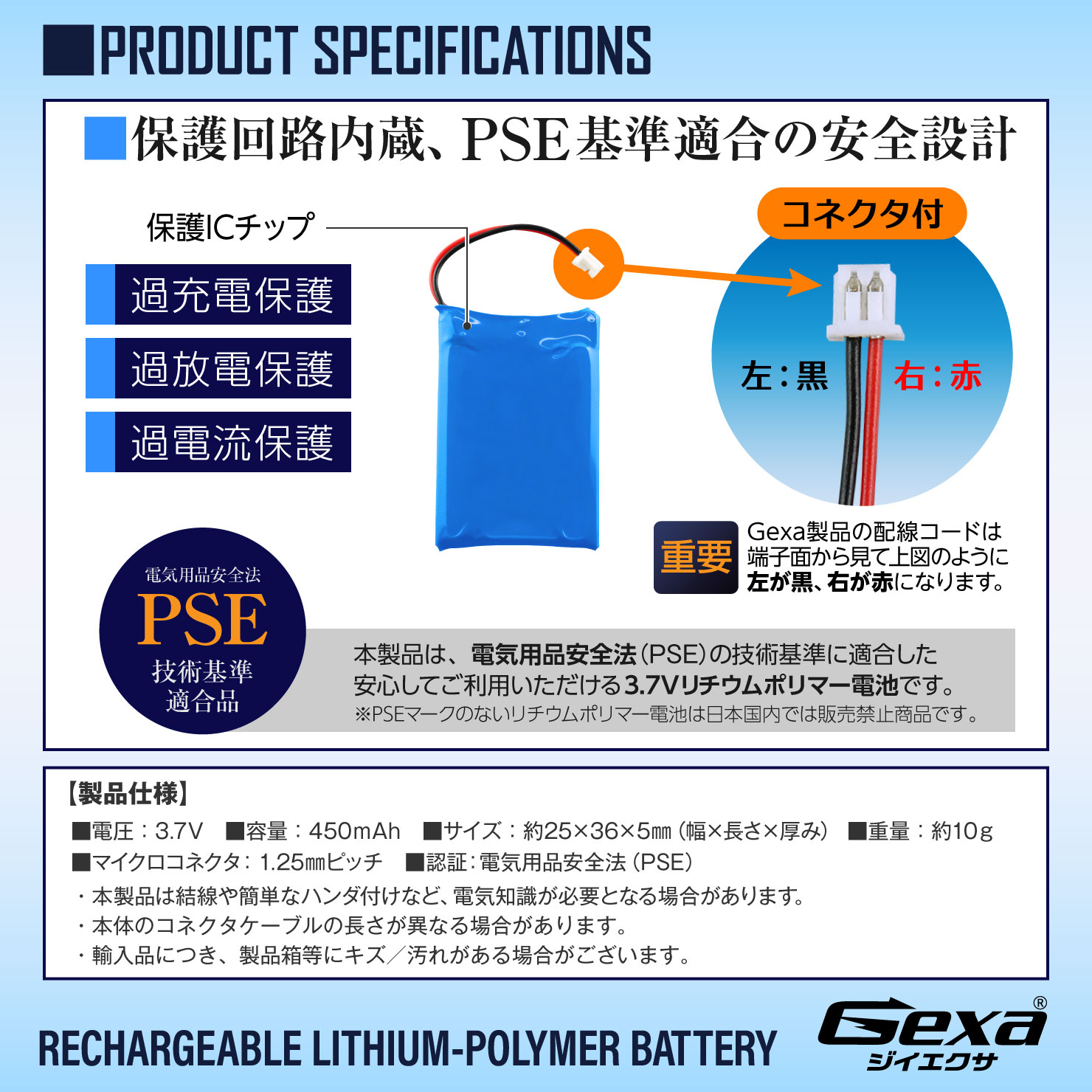 リチウムポリマー電池 3.7V 450mAh GA-033 Gexa ジイエクサ