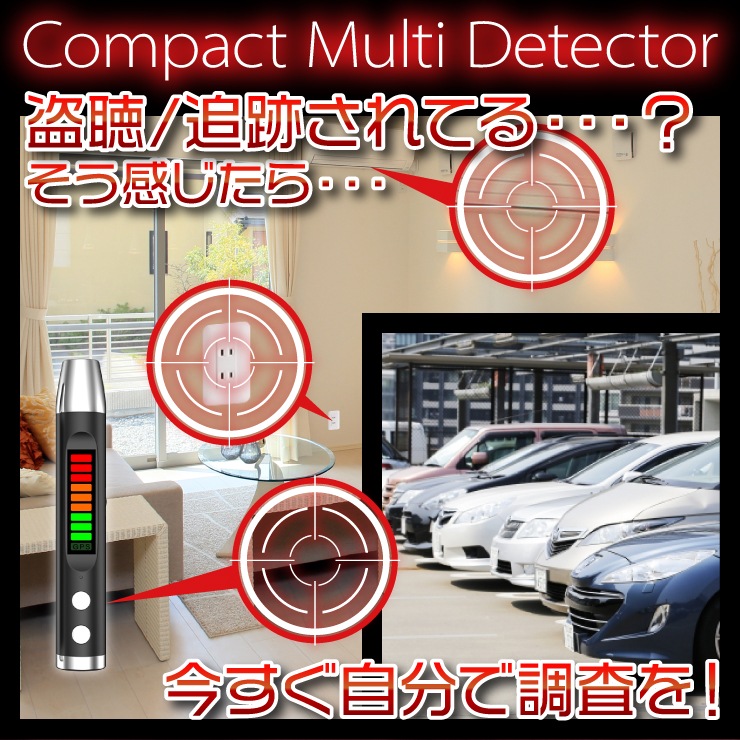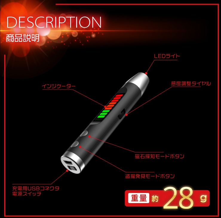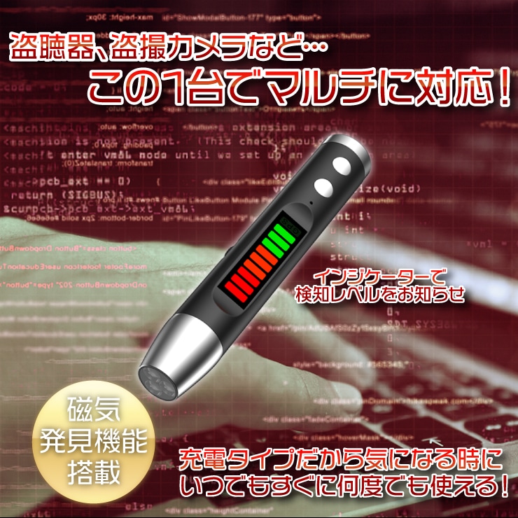 磁石(マグネット)に反応する磁気探知モードを搭載。家電等(小型カメラ、GPSなど)に磁石が付属・搭載されている場合に発見の役に立ちます。