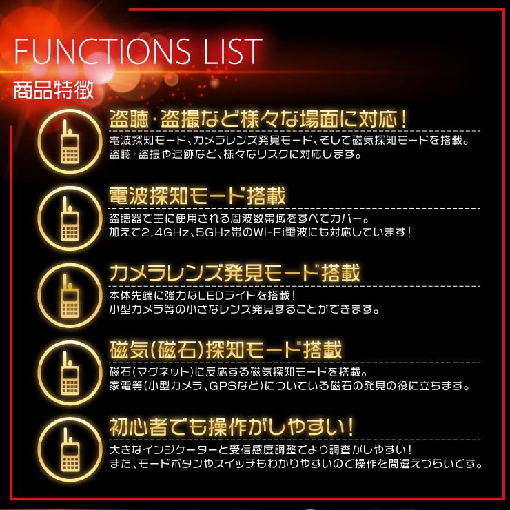 | 主な機能 | ・電波探知モード ・カメラレンズ発見モード ・磁気探知モード |