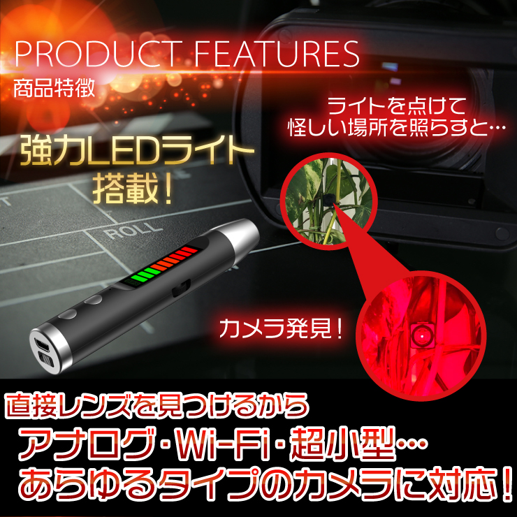 強力な赤色LEDライトを搭載し、小型カメラ等の小さなレンズでも発見することができます。