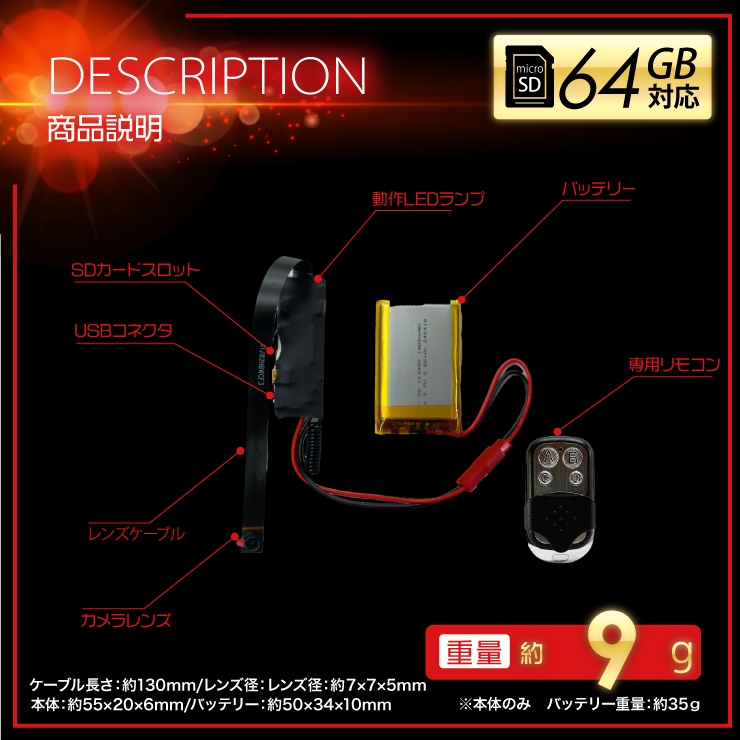 | 付属品 | USBケーブル・MicroSD 64GB・ACアダプタ専用リモコン・専用バッテリー・日本語説明書 |