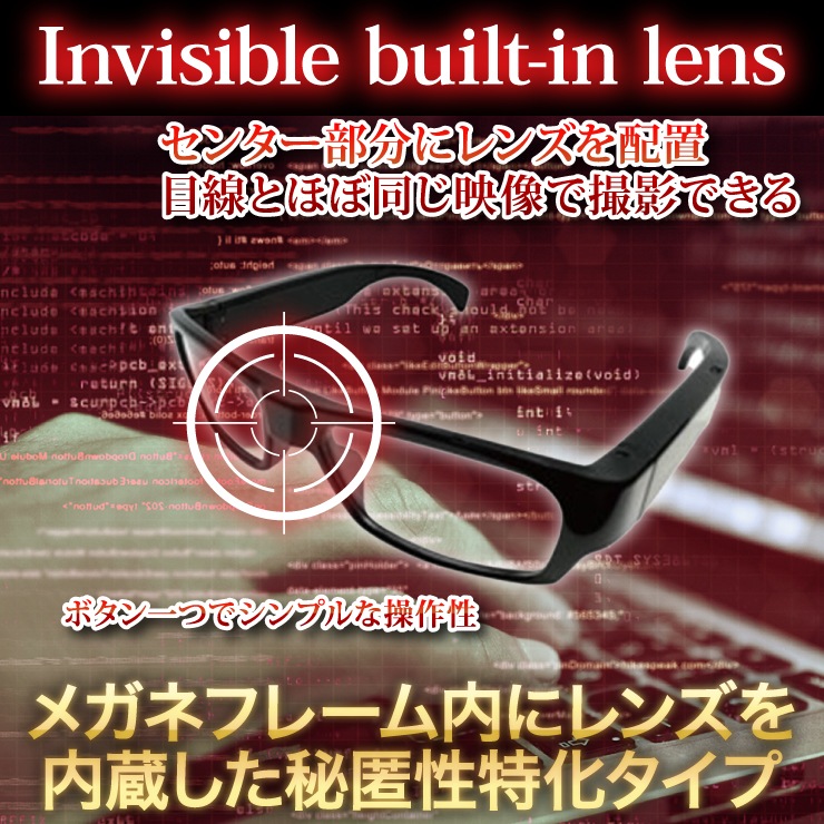 カメラレンズはメガネのフレーム内に入っているため、レンズが見つけにくい構造になっております。