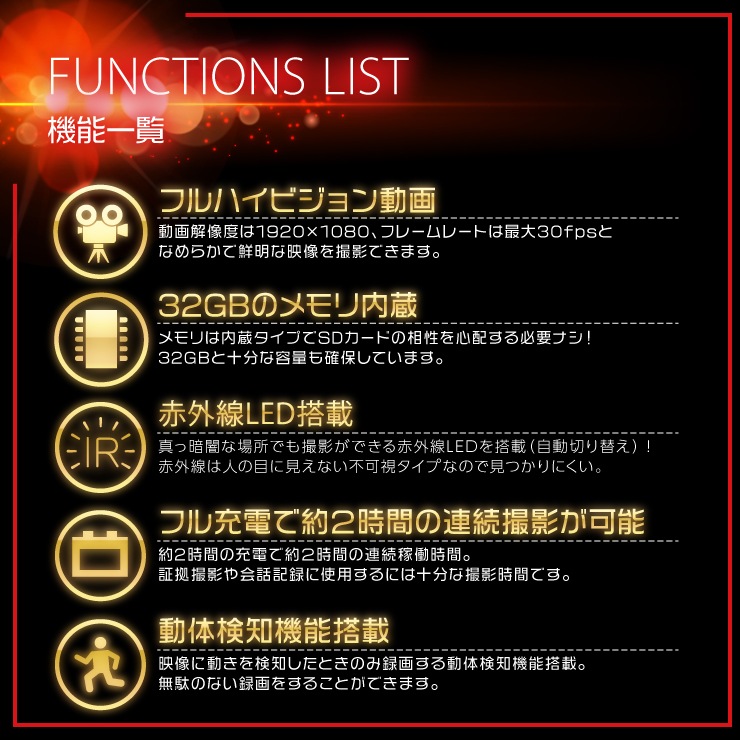| 機能 | 動画撮影・写真撮影・ボイスレコーダー・不可視赤外線・動体検知・外部電源機能・自動上書 |