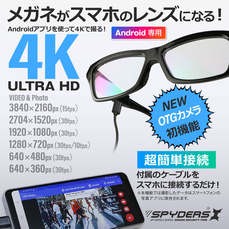 スパイダーズX 4K 暗視補正 メガネ型カメラ E-209 スパイカメラ 小型カメラ