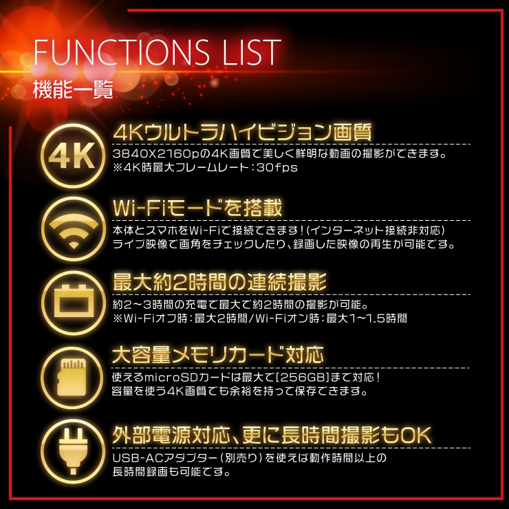 | 機能 | ・動画撮影 ・静止画撮影 ・動体検知 ・Wi-Fi機能(AP接続) ・外部電源機能 ・自動上書 |